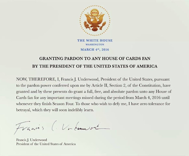 Although this is all just for entertainment purposes, this level of attention to detail makes the show feel very real indeed. It is a marketing campaign fit for a real presidential candidate, not just one being played out for drama.  On Twitter this week the President even issued a pardon to House of Cards fans to miss any important meetings they may have until they finish watching the fourth season.  Of course, those who defy the President's orders would be met with zero tolerance for betrayal to the show.