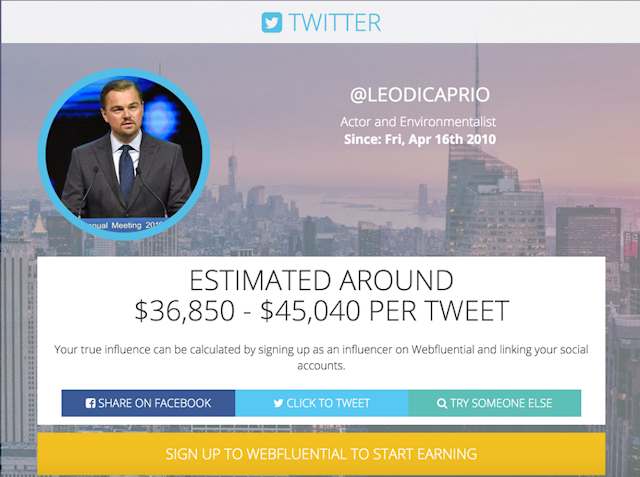 The current queen of Twitter, Katy Perry, has a worldwide following just short of 85 million. To put that number into perspective, that’s more than two and a half times the population of Australia following her handle @katyperry. Should she wish to monetise her postings she could look to pocket up to $70,425 per tweet. Lenardo Di Caprio may have just won an Oscar, but with only 15 million followers by comparison he could potentially earn up to $45,035 for each Twitter post. These numbers may seem relatively small to the uber-rich celebrities with millions of followers, but social influencers with large followers can use metrics such as Wefbluential to gauge their own value and connect with potential clients.